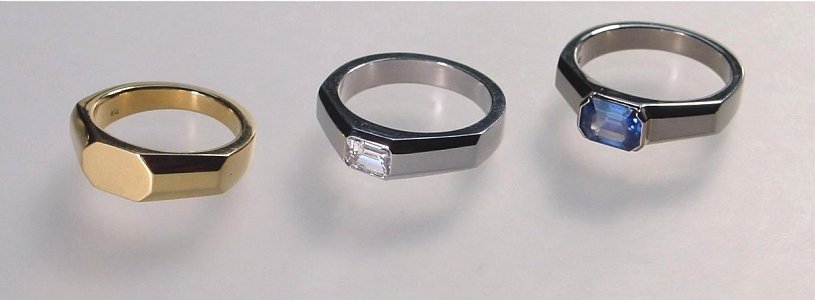 Bei dieser Art von Ringen ist die Schiene selbst facettiert - durch sechs Flächen rechts und links ergibt sich oben ein Achteck, darum sollen Steine darauf auch achteckig sein wie der Brillant auf dem Weissgoldring in der Mitte